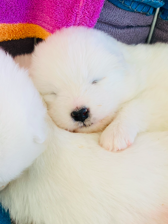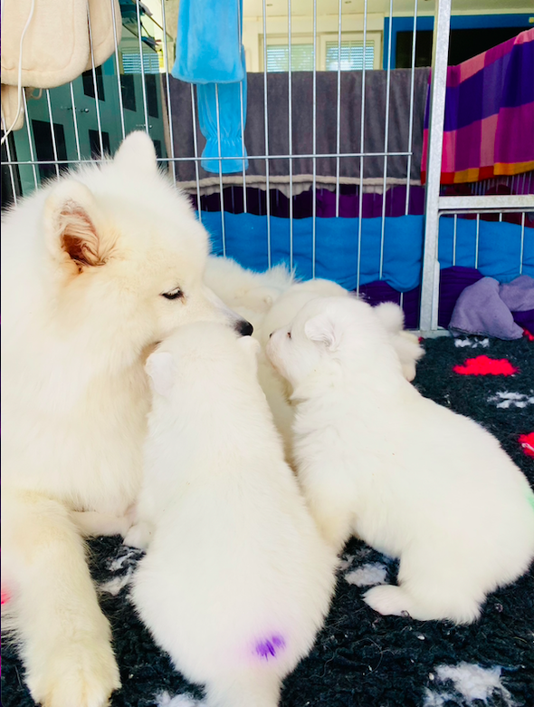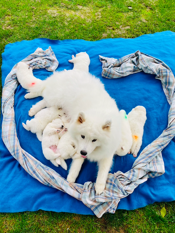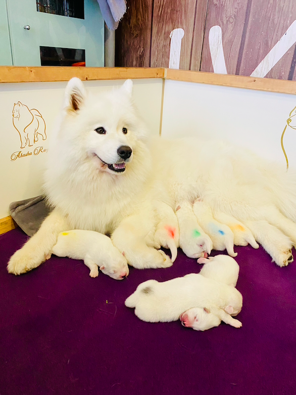 On September 30th 2021 gave 💙Saya💙 birth to seven wonderful puppies - 3 boys 💙🖤💚 & 4 girls 💛💜🧡❤️. Mommy and puppies are doing great 🥰