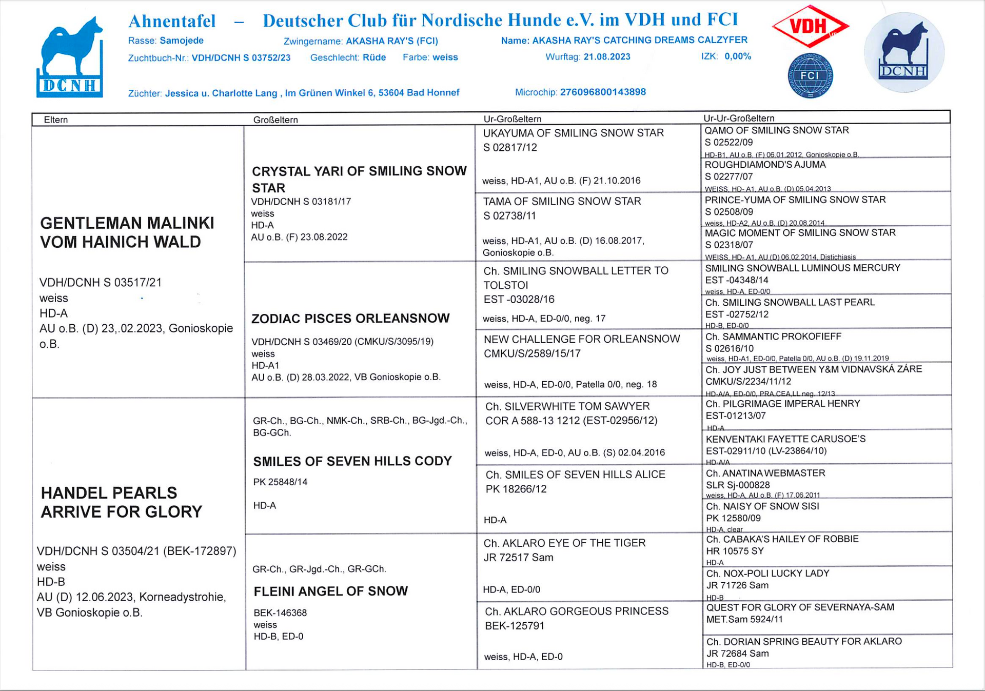 Pedigree: Akasha Ray ́s Catching Dreams Calzyfer